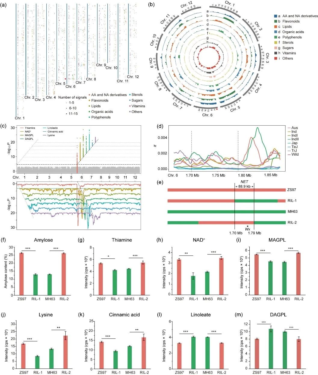 罗杰团队综合利用基于代谢物的全基因组关联分析(mGWAS)、数量性状位点分析(mQTL)、转录组测序和植物稳定转化等多种手段在水稻6号染色体上定位并鉴定了一个调控维生素、氨基酸、脂类和多酚等重要营养物质积累的位点,并命名为NET(nutrition, eating, taste)。该位点中的Wx基因除了调控水稻食味品质以外,还参与调控谷粒中维生素B1和脂类的积累,而多酚和氨基酸等物质则由NET中其他基因调控。
