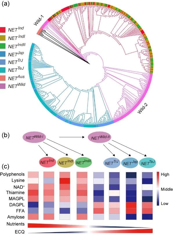进一步通过构建系统进化树、计算遗传距离以及检测混池样品的代谢组,发现籼稻和粳稻的NET分别起源于两个不同的野生稻亚群,Wild-1和Wild-2。起源于Wild-1的籼稻中各类营养代谢物含量保持在较高水平,但由于其高比例的直链淀粉和低含量的脂肪酸,籼稻亚群的口感相对较差。而起源于Wild-2的粳稻因其较低比例的直链淀粉和高含量的脂肪酸,所以口感相对较好,但各类营养代谢物的含量却处在较低水平。这说明水稻育种过程中食味品质和营养品质没有得到有效的平衡。因此,为满足“吃好”的目标,有必要考虑到育种过程中营养物质含量的变化,达到两全其美,而NET可能是实现这一目标的重要的遗传位点之一。