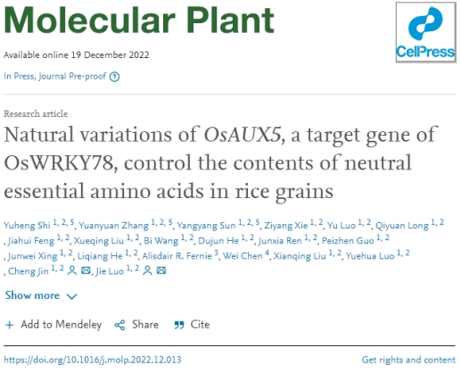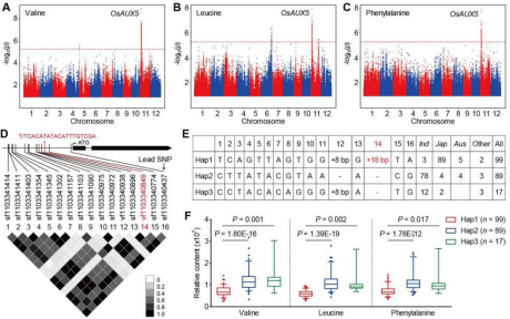 近日,入驻公司三亚南繁研究院的罗杰教授团队在Molecular Plant (IF=21.9)上在线发表题为“Natural variations of OsAUX5, a target gene of OsWRKY78, control the contents of neutral essential amino acids in rice grains” 的研究论文。该研究利用全基因组关联分析(GWAS)鉴定到控制水稻籽粒多种EAA积累的关键基因OsAUX5,为水稻营养品质改良提供了重要基因资源。