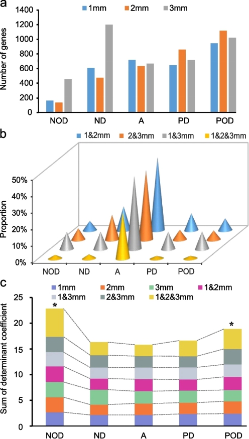 该研究中,作者通过对418个水稻杂种组合及其亲本,2808份玉米杂种组合及其亲本,及1600余份小麦杂种组合及其亲本在多个环境下的表型分析,发现不同环境对杂种的影响普遍强于自交系亲本,不同组合类型、不同性状以及不同环境杂种优势表现差异明显,表明杂种优势的表现高度依赖于环境。分析全基因组关联分析检测到的亲本、杂种及中亲优势相关QTL及其遗传效应(加性、显性、超显性),发现非加性QTL相比于加性QTL对不同环境或遗传背景的变化更为敏感。对优良杂交组合两优培九及其双亲(培矮64S和9311)的幼穗转录组数据分析表明,非加性表达条件下对遗传背景(其转录因子)的依赖性高于加性表达条件下(图1)。上述结果表明,杂种优势以及非加性效应的形成高度依赖环境以及遗传背景。