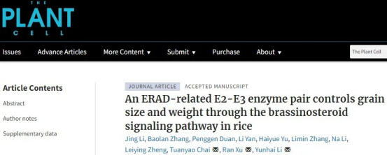 2022年12月15日,Plant Cell在线发表了中国科公司遗传与发育生物学研究所李云海团队完成的题为“An ERAD-related E2-E3 enzyme pair controls grain size and weight through the brassinosteroid signaling pathway in rice“的研究论文,入驻公司三亚南繁研究院的徐冉教授和中国科公司大学柴团耀教授为本文共同通讯作者。