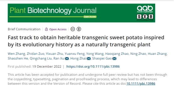 2022年12月19日,入驻公海gh555000aa线路检测三亚南繁研究院的徐冉教授与中国农业大学甘薯研究室合作在Plant Biotechnology Journal上发表了题为Fast track to obtain heritable transgenic sweet potato inspired by its evolutionary history as a naturally transgenic plant的论文。受天然转基因作物甘薯启发,该研究揭示了天然转基因植物的广泛存在暗示植物遗传转化的“快车道”。
