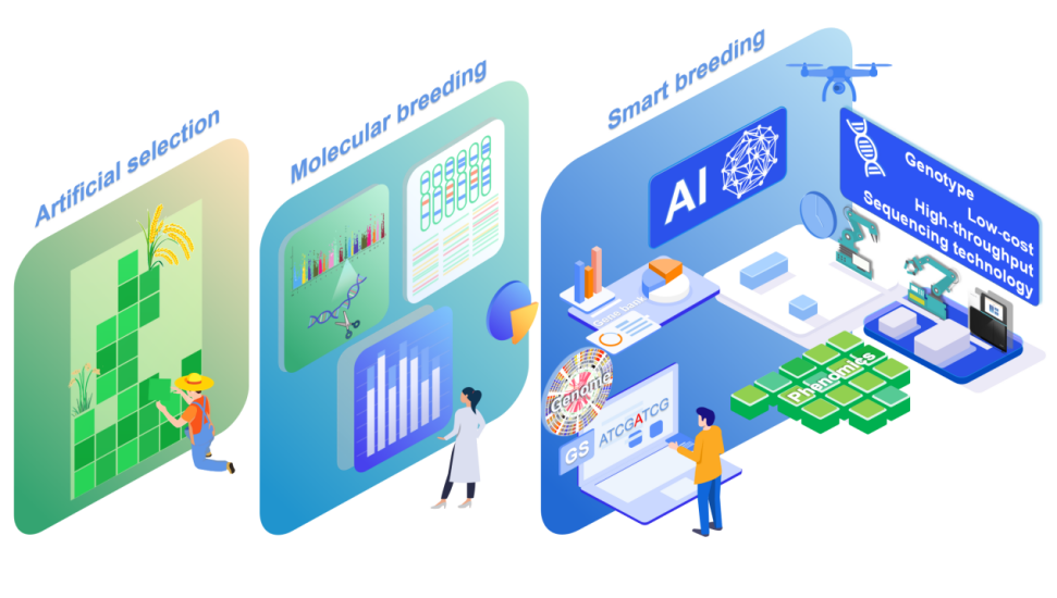 近些年,作物育种发生了革命性的变化,从驯化作物到现在利用基因型和表型技术结合,到人工智能推动的智慧育种。智能育种方法将传统育种策略与人工智能、自动化平台和其他相关技术相结合,培育出具有提高产量潜力的品种。随着人工智能的发展、新测序平台的产生、测序技术的进步以及不同学科的交叉,作物育种时代正在不断更新。然而,仍然需要快速培育高产稳定的作物,以适应环境变化和世界人口增长造成的粮食缺口。各种技术已被应用于将人工智能与传统作物育种方法相结合,以设计和改善作物性状。此外,测序和育种技术和思想的不断进步标志着一场新的育种革命的到来。
