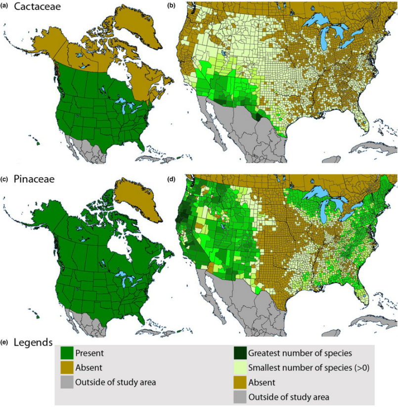 图2. 北美墨西哥北部原生仙人掌科和松科植物的地理分布