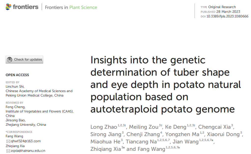热带作物基因组大数据育种团队在“Frontiers in Plant Science”上发表了“Insights into the genetic determination of tuber shape and eye depth in potato natural population based on autotetraploid potato genome”的研究论文。