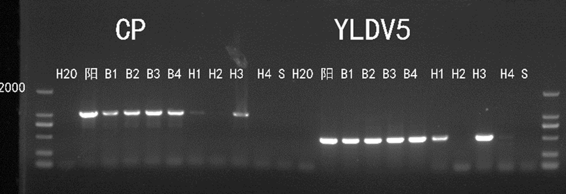 注:B1、B2、B3、B4为槟榔叶片,H1、H2、H3、H4分别为槟榔树上的黄吹绵蚧壳虫,Maker:D2000,引物为CP-new(1000bp);YLDV5(500bp)。