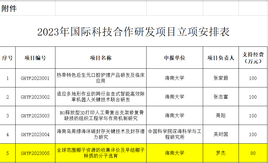 2023年4月海南省科技厅发布关于2023年国际科技合作研发项目立项的通知,代谢生物学团队罗杰教授主持的全球范围椰子资源的收集评价及早结椰子种质的分子选育项目获得立项资助,资助经费80万元。