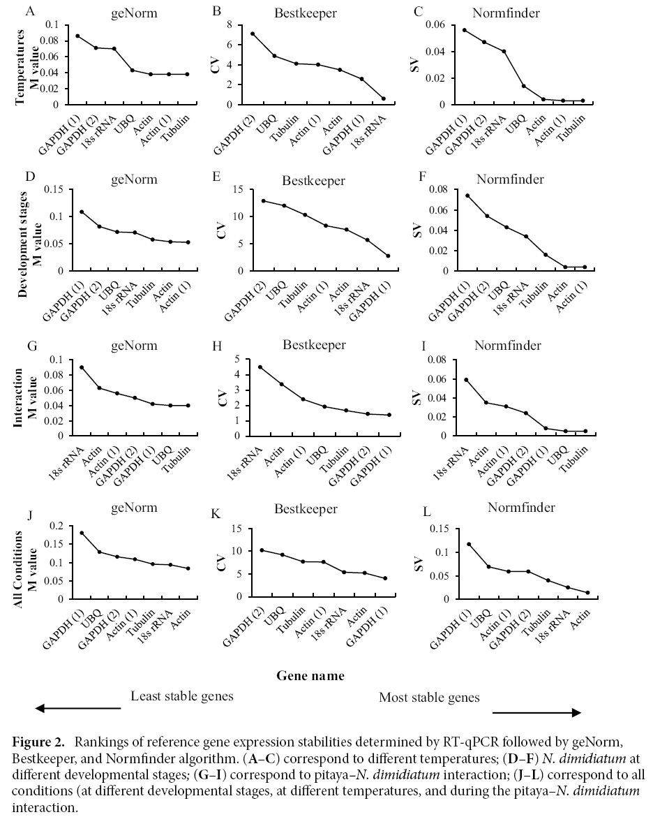 图6. Rankings of reference gene expression stabilities determined by RT-qPCR followed by geNorm,Bestkeeper, and Normfnder algorithm.