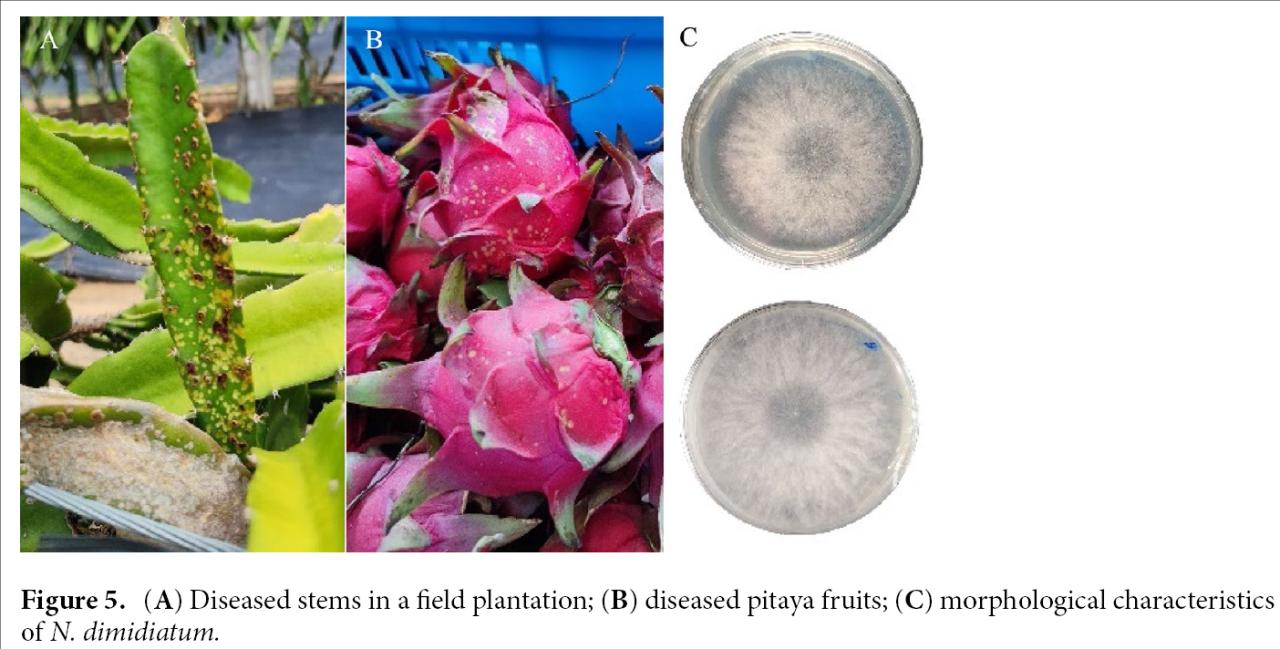 图5. (A) Diseased stems in a feld plantation; (B) diseased pitaya fruits; (C) morphological characteristics of N. dimidiatum.