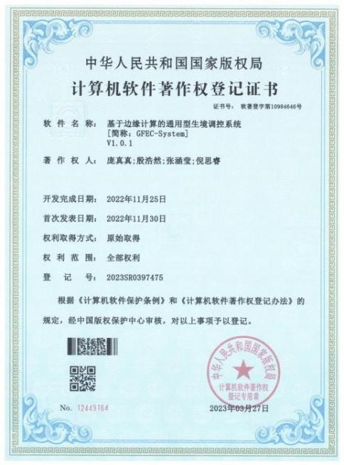 热带水果品质发育调控科技创新团队成员庞真真副教授及团队研究生获软件著作权《基于边缘计算的通用型生境调控系统》。其中Geek-Fox Smart EC System(简称GFEC-System)作为该系统的控制及功能软件,基于Fox OS 9.0 Embedded Edition 环境框架的自研嵌入式实时系统,集成了环境参数自动采集,边缘计算+AI实时分析,参数交互式可视化、环控执行器自动化控制等组件。主要实现了传感器阵列数据自动读取;环控执行器自动配置与远程操纵;环境参数自动分析计算、交互式可视化与人工智能决策,物联网的通讯与组网等功能。