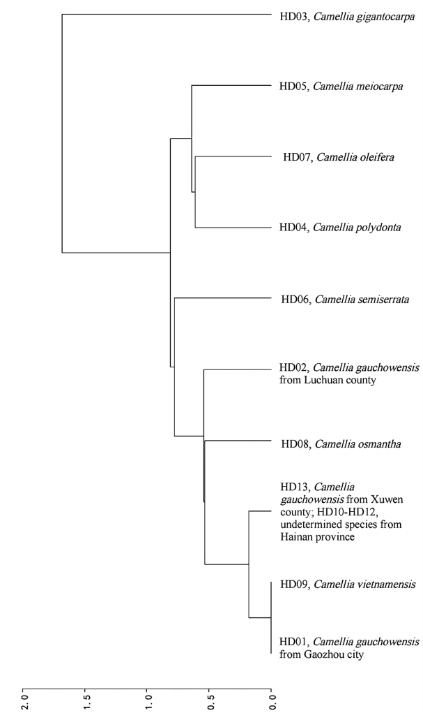 热带水果品质发育调控科技创新团队成员陈静博士为第一作者、周开兵教授为通讯作者,4月中旬在forests上发表论文《Synonymous Codon Usage Bias in the Chloroplast Genomes of 13 Oil-Tea Camellia Samples from South China》,在油茶叶绿体基因组(cpDNA)同义密码子使用偏好性特点、形成机理及其科学意义等问题的研究上取得新进展。研究结果表明,油茶cpDNA密码子碱基组成偏好于A、T,且第三位碱基严重偏好于碱基A、T,同工密码子使用偏好性较弱,其主要受选择效应影响,同时突变效应的影响也不可忽视;筛选到28个优势密码子,第三位碱基为U、A、C和G的密码子分别为11、9、7和1个,与高频密码子求交集而筛选出20个最优密码子,第三位为U、A、C和G的密码子分别为11、8、0和1个;基于不同样品cpDNA的同工密码子相对使用度(RSCU)构建不同样品进化树形图,供试样品聚成6类(r2=0.9190,图1),越南油茶和高州油茶应合并为同一个种,海南油茶待定种属于越南油茶。因此,本文研究结果为油茶叶绿体基因表达规律和基因工程技术开发研究奠定了基础,同工密码子偏好性具备种的特异性,可以用于油茶种及其演化关系的鉴定。
