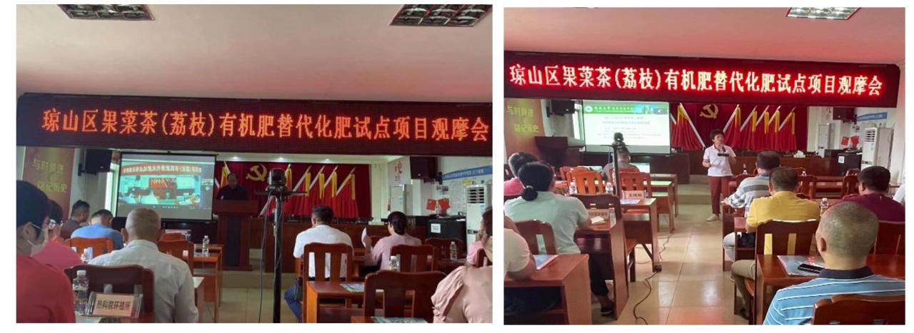 4月26日,热带耕地养分资源循环利用与质量保育团队参加农业农村部“果菜茶(荔枝)有机肥替代化肥试点项目”观摩会,项目专家组成员阮云泽教授总结了利用琼山区畜禽粪便和秸秆等农林废弃物资源生产符合荔枝需求的专用有机肥工艺与配方,并通过小区-核心区-推广区的试验结果提出琼山荔枝推荐施肥量、荔枝专用配方肥及适宜的有机肥替代无机的比例等科学施肥技术内容。