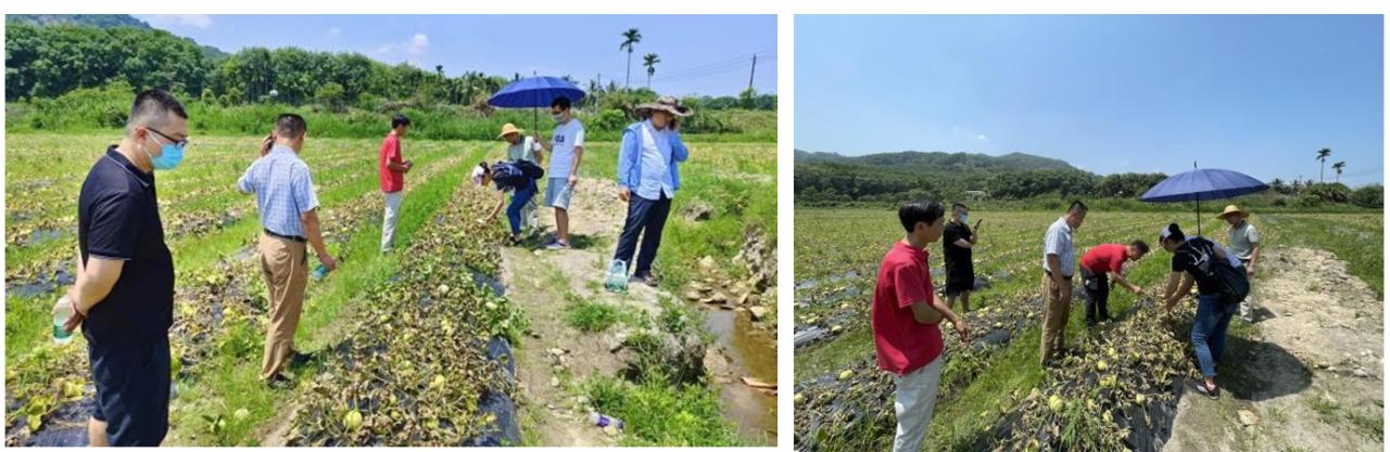2023年5月17日,热带瓜类作物种质资源创新利用团队骨干教师江雪飞教授率队赴琼中县湾岭镇东坡岭开展甜瓜种植技术指导,帮助种植户诊断露天种植甜瓜茎蔓枯黄的原因及后续管理的注意事项。