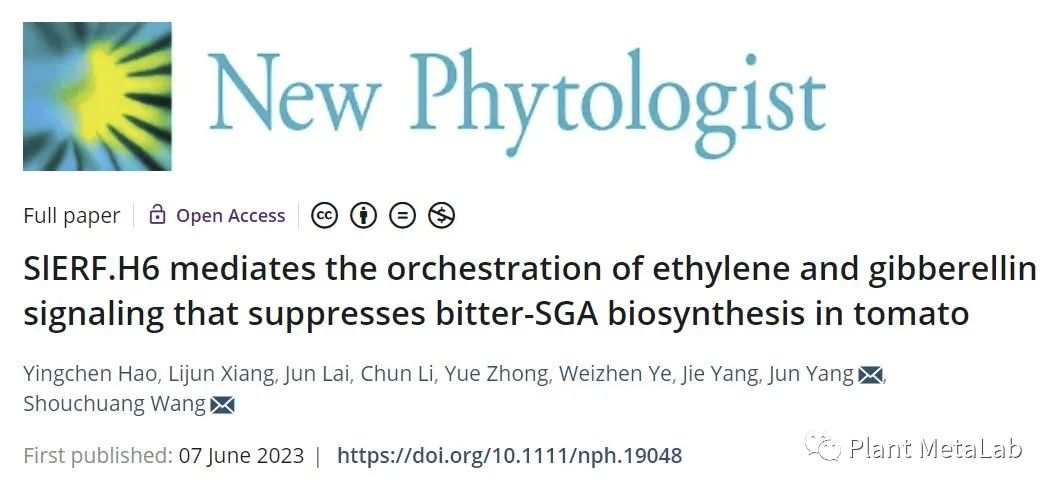2023年6月8日公海gh555000aa线路检测热带作物公司/三亚南繁研究院王守创团队在国际学术期刊New Phytologist(中科院1区TOP,IF:10.323)上发表题目为“SlERF.H6 mediates the orchestration of ethylene and gibberellin signaling that suppresses bitter-SGAs biosynthesis in tomato”的研究论文。该研究使用正向遗传学,借助全基因组关联分析发现一个AP2/ERF转录因子SlERF.H6,解析了其在调节乙烯和赤霉素之间的串扰信号进而调控SGA生物合成中的关键作用。该不仅为解析SGA调控机制提供了新思路,也为人们采用多种技术来培育优良番茄品种奠定一定的基础。
