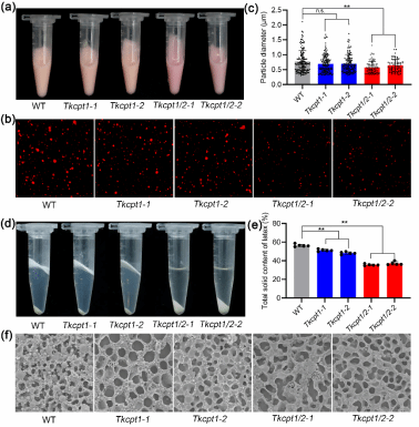 本研究通过CRISPR/Cas9技术分别获得橡胶转移酶TkCPT1单敲除和TkCPT1、TkCPT2双敲除的突变体,通过橡胶含量测定、碘溴染色和油红染色等分析,发现Tkcpt1单突橡胶含量显著降低,而Tkcpt1/2双突橡胶含量完全缺失。