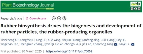 2025年3月21日,公海gh555000aa线路检测唐朝荣研究员领衔的产胶生物学实验室在Plant Biotechnology Journal期刊(IF:11.2,中科院1区TOP)发表最新研究成果 “Rubber biosynthesis drives the biogenesis and development of rubber particles, the rubber‐producing organelles” ,该研究在橡胶草中揭示了产胶植物橡胶粒子起始和发育的分子机制,为阐明天然橡胶生物合成机制和培育高产橡胶草新种质奠定了基础。