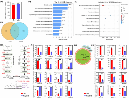 通过对转基因植株的胶乳组织进行转录组和蛋白质组学分析发现,橡胶生物合成通路中的基因在转录水平没有显著变化,但在蛋白水平显著降低,表明Tkcpt1/2突变体是在蛋白水平阻断了橡胶生物合成通路。