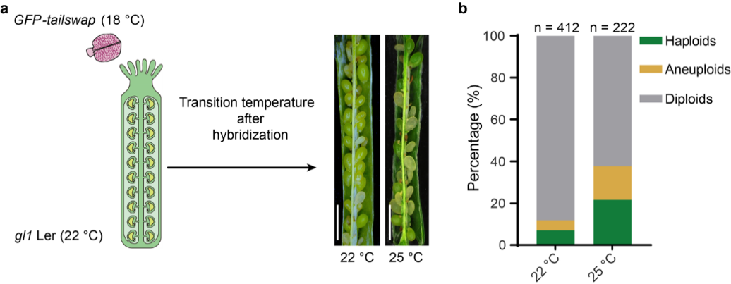 李靖课题组在研究单倍体形成机理中发现,相比于野生型植株,拟南芥中最经典高效的单倍体诱导系,GFP-tailswap的花粉活力和单倍体诱导能力都对环境温度高度敏感。轻微的提高(22 °C到25 °C)环境温度既可造成GFP-tailswap花粉活力几乎完全丧失,而单倍体诱导能力却显著提升,而降低温度则有完全相反的效应。作者进一步发现诱导能力对环境的敏感性是基于CENH3的诱导系的普遍特性。基于该发现,通过提高温度可以直接在简化去雄和提高诱导效率两方面同时优化父本单倍体的诱导过程。但是对于使用诱导系花粉进行母本单倍体诱导来说,改变温度产生的是一对相互矛盾的效应,如提高温度虽可以提高效率但严重降低了花粉的活力,使得诱导实际上难以执行。经过认真的分析验证,作者们发现,温度对诱导效率的影响主要发生于受精后,即独立于对花粉活力的影响。该发现促使得作者们设计了一个通过使用低温回复的花粉在高温条件下诱导母本单倍体的策略。使用该策略,他们成功的在花粉供给和诱导效率两个方面显著优化了母本单倍体的诱导。