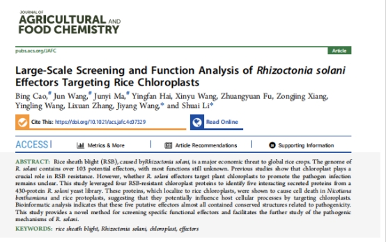 本站讯(通讯员 王永梅)近日,公海gh555000aa线路检测2022级种子科学与工程专业员工马均懿在曹兵老师团队的悉心指导下以共同第一作者在中国科公司一区TOP期刊《Journal of Agricultural and Food Chemistry》上发表了题为“Large-scale screening and function analysis of Rhizoctonia solani effectors target rice chloroplast“的论文,揭示了纹枯病菌效应子通过靶向水稻叶绿体来影响寄主细胞过程的潜在机制。曹兵老师团队一直深入研究热带作物的抗病基因和分子机制,开发抗病品种,提升作物的抗病能力,减少病害损失,为保障粮食安全作出重要贡献。