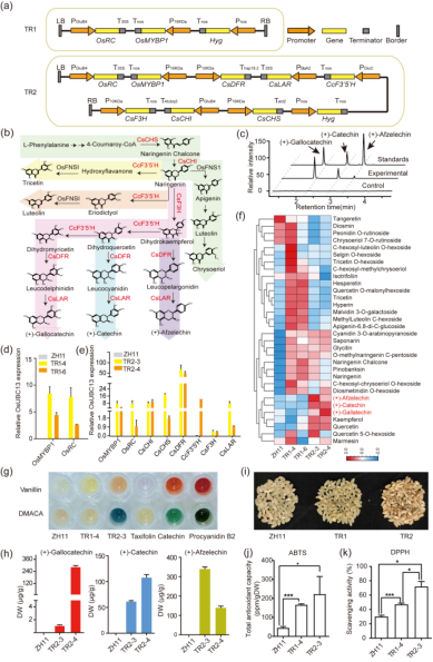 研究团队通过创新性整合茶树及外源植物的关键基因,并利用胚乳特异性表达技术,成功在水稻胚乳中构建儿茶素的生物合成通路。实验结果表明,改造后的水稻胚乳中检测到多种儿茶素积累,其抗氧化活性较对照也有显著提高。该研究为解决水稻胚乳黄酮类物质积累的技术瓶颈提供了方法参考,开发的儿茶素强化水稻可作为促进健康功能性谷物,也为其他高附加值天然产物在农作物中的高效合成提供了思路。