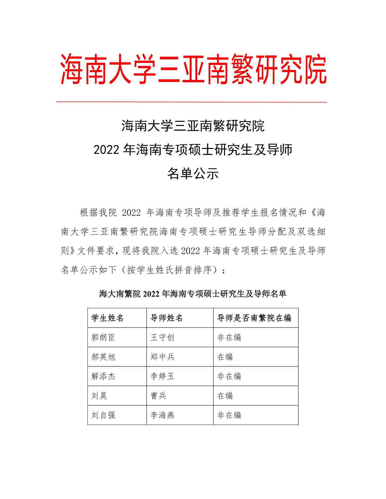 公司三亚南繁研究院海南专项硕士研究生及导师名单公示