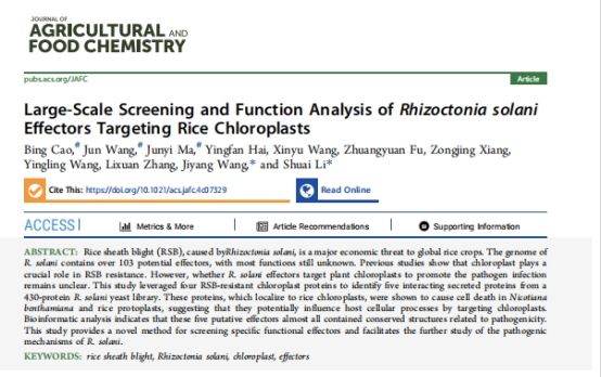 本站讯(通讯员 王永梅)近日,2022级种子科学与工程专业员工马均懿在曹兵老师团队的悉心指导下以共同第一作者在中国科公司一区TOP期刊《Journal of Agricultural and Food Chemistry》上发表了题为“Large-scale screening and function analysis of Rhizoctonia solani effectors target rice chloroplast“的论文,揭示了纹枯病菌效应子通过靶向水稻叶绿体来影响寄主细胞过程的潜在机制。曹兵老师团队一直深入研究热带作物的抗病基因和分子机制,开发抗病品种,提升作物的抗病能力,减少病害损失,为保障粮食安全作出重要贡献。
